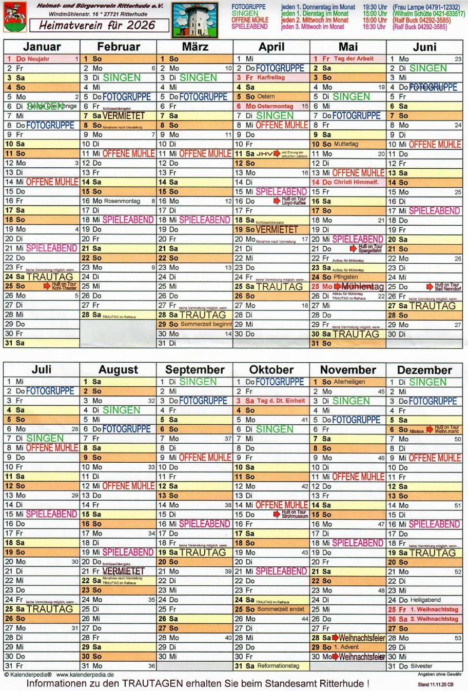 Belegungskalender der Ritterhuder Mühle 2026