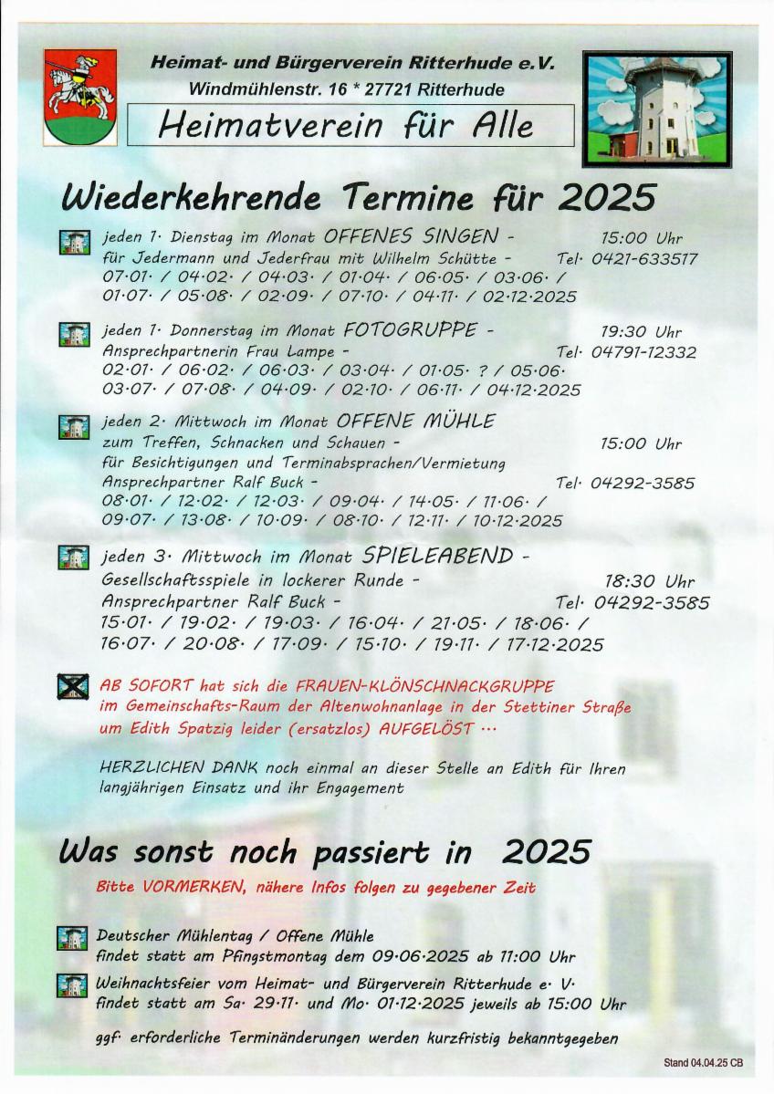 TERMINEDatum- Beginn- Art und Ort der Veranstaltung- AnsprechpartnerAb sofort ist die Ritterhuder Mühle für Veranstaltungen des Heimat - und Bürgervereins Ritterhude wieder geöffnet. ![]() ________________________________________________________________ |